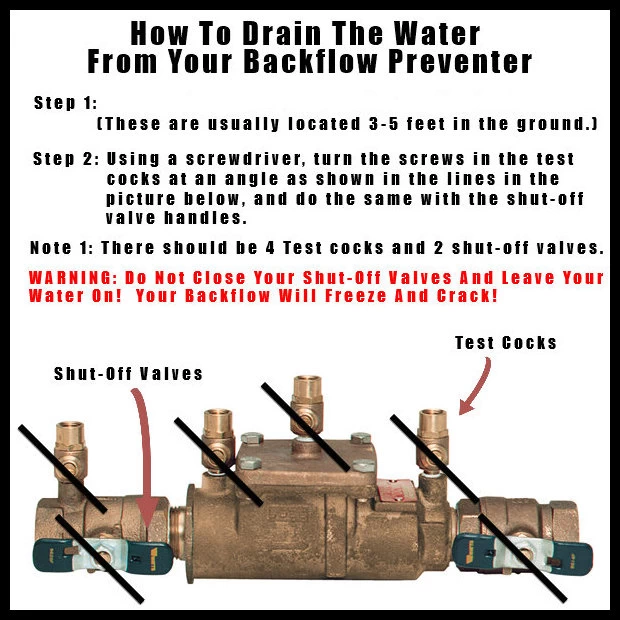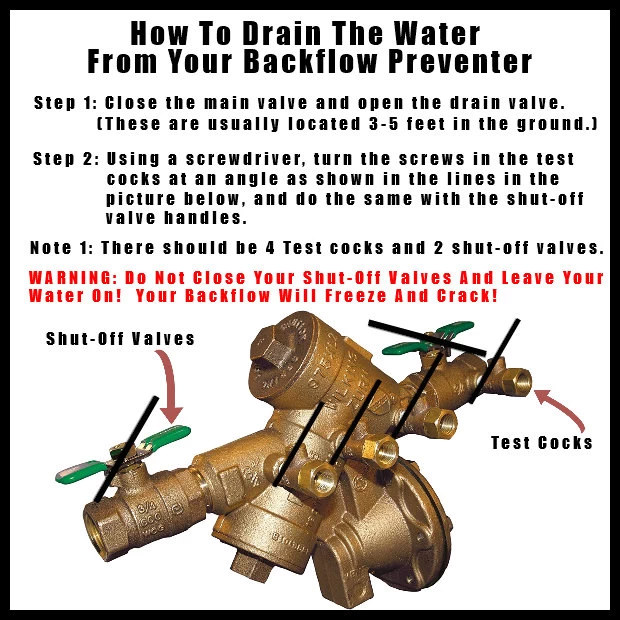 Below are images of the most common sprinkler and irrigation components, each showing how to properly drain and protect them before freezing temperatures arrive.