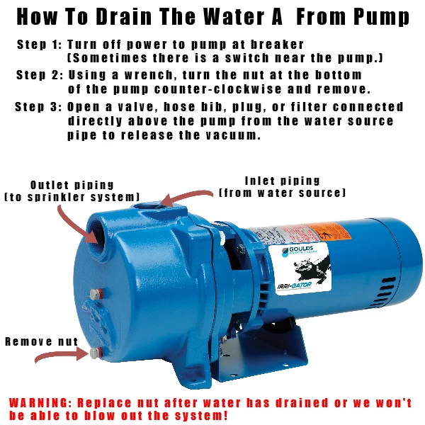 Turn off power at the breaker or nearby switch, then remove the small drain nut at the bottom of the pump with a wrench. Open a hose bib or plug above the pump to release vacuum pressure and allow all water to drain completely. Replace the nut after draining so the system can be properly blown out later.
