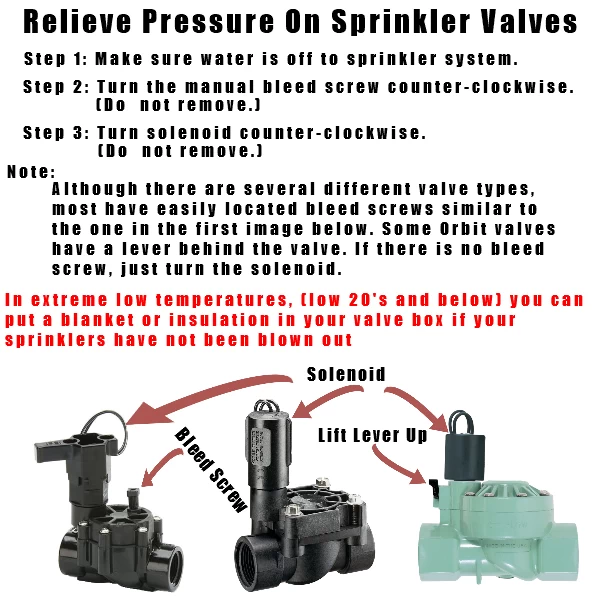 If your system hasn’t been blown out yet, you can relieve pressure by turning the small manual bleed screws on each valve counterclockwise (do not remove them). You can also twist the solenoid slightly counterclockwise to let trapped air or water escape.